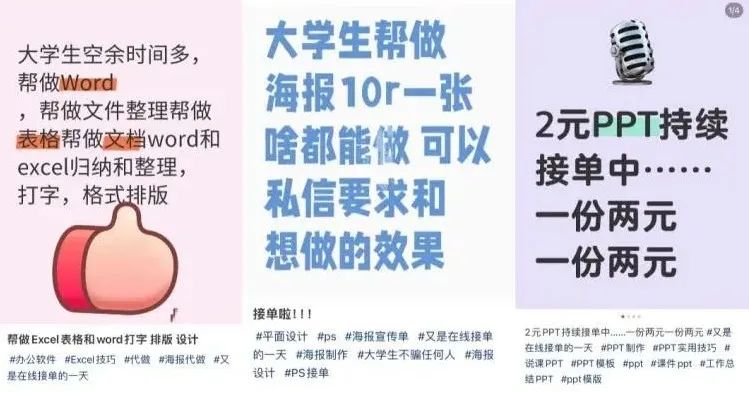 收罗上比拟流行的几类“职责转包”内容,包括代写案牍、代作念PPT、代作念海报、调遣形状等。从这些内容来看,打工东说念主将职责转包不为别的,就图一个定心,比如,案牍改了又改,干脆找个外包去改,我方只崇敬寄语;再比如,大学也没一门课故意教PPT怎么作念,干脆花个几十块钱在民间找个熟手。这么一来,对打工东说念主也算是“花小钱办大事”。
