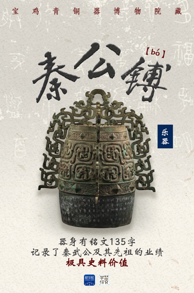 这件秦公镈是大型打击乐器,器身有135字铭文,记叙了秦襄公被周平王“赏宅受国”的历史,以及文公、静公、宪公三代治国兴邦的事迹,是商量秦国早期历史的迫切什物质量。